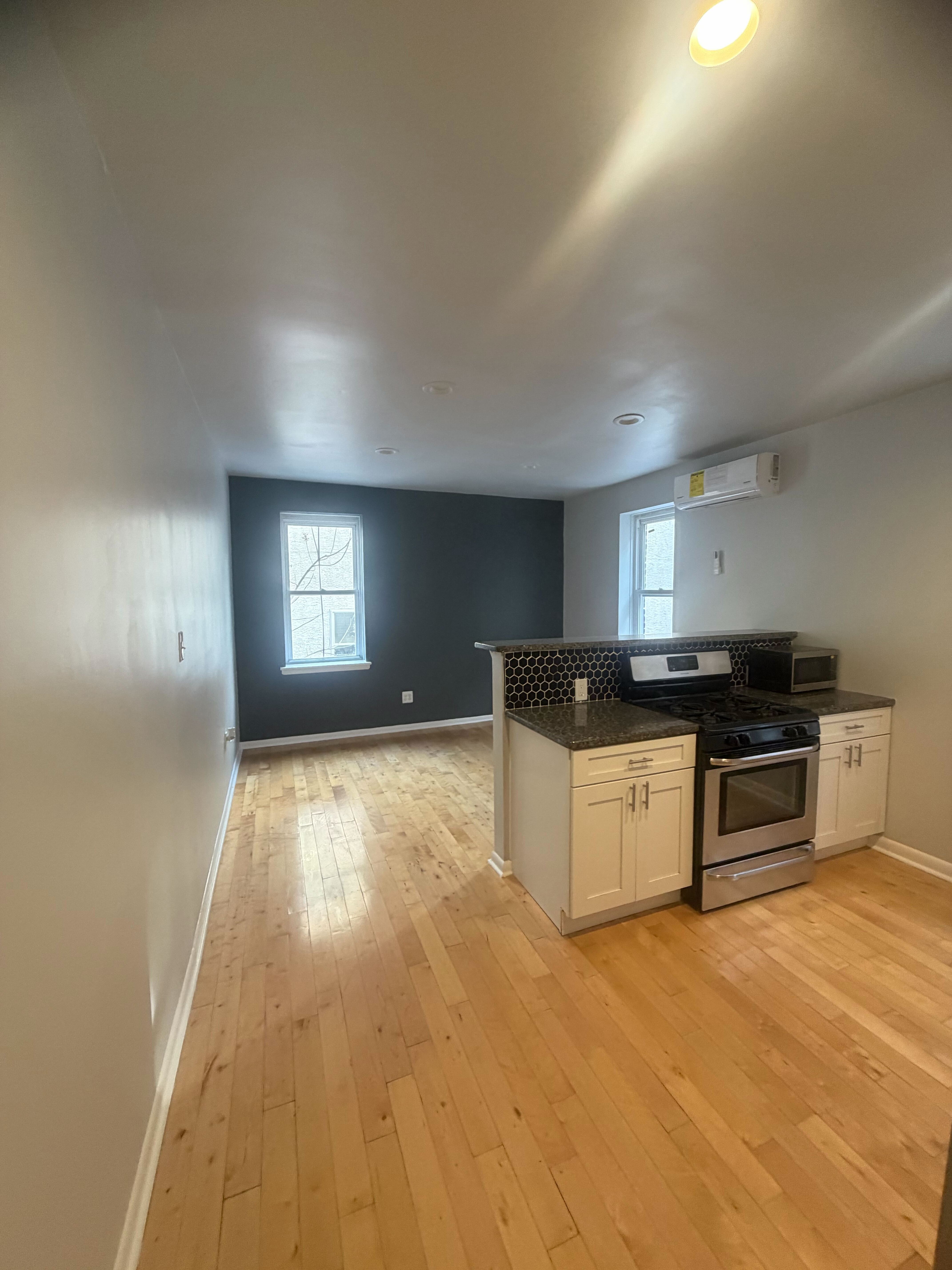 beautiful modern update, stainless steel appliances all installed, double door refrigerator, dishwasher, garbage disposal, granite countertops, backsplash, white cabinets, recess lighting, accent wall